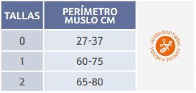 Fabricado en material semirrígido transpirable tricapa de (poliamida, espuma y poliéster), compuesto por una placa lumbar con cinchas y hebillas para fijación en el respaldo de la silla o sillón, se desplaza por debajo de los glúteos hacia el perine abrazando los muslos de su interior hacia las caderas. En los extremos inferiores nacen las cinchas para muslos con correas de ratier en su extremo y hebillas de cierre y pasadores para regular su ajuste. Cinchas de regulación y sujeción con hebillas de cierre identificadas mediante código de colores para facilitar su colocación.