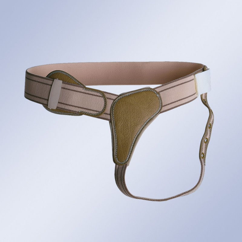 Cinturón elástico con cierre de hebilla, almohadillas anatómicas de mayor tamaño que las de los bragueros de cierre velcro, que prolongan con tirantes bajo glúteos y se fijan a los laterales.