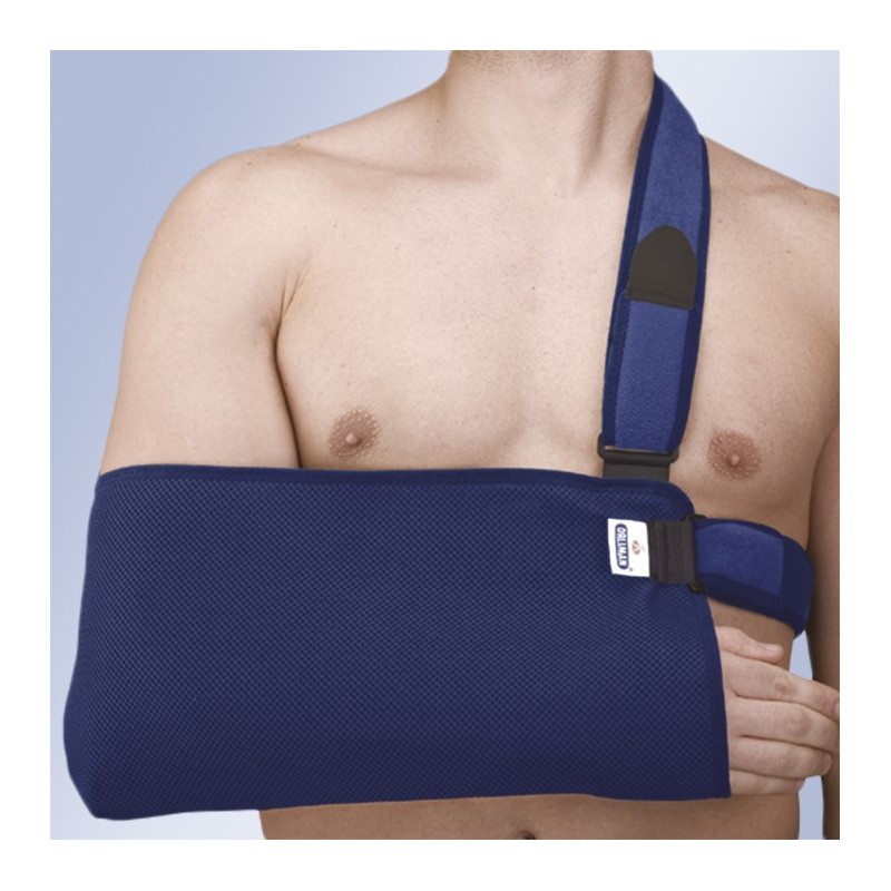 Fabricado con tejido transpirable de panal en forma de bolsa para codo y antebrazo. Dispone de una banda de ajuste que permite regular la altura del brazo. Se suministra una banda de ajuste en cintura inmovilizadora del hombro.