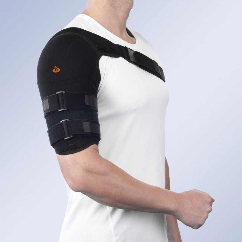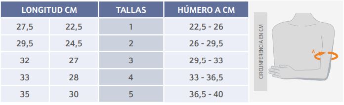 Ortesis de húmero bivalva termoconformada en polietileno de baja densidad, recubierto de una funda textil acolchada. Forro interior de tejido de panal transpirable. 2 valvas termoplásticas ensambladas en el forro unidas mediante tejido elástico. Sistema de ajuste mediante 2 cinchas humerales en velour y cierre microgancho. Sistema de suspensión y fijación mediante cincha pectoral. El brace viene acompañado de cincha para la desgravación del brazo.