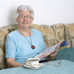 Moderno y de fácil funcionamiento, este económico sistema de alarma de fabricación alemana no requiere instalación ni cables. Se compone de un receptor que se enchufa a la red en cualquier lugar de la casa y recibe una señal por radio cuando la persona presiona el botón del emisor que lleva en el colgante de cuello. Al presionar levemente el botón del emisor, suena una alarma en el receptor que se puede combinar con una señal luminosa. Receptor de la señal de alarma tiene 3 diferentes melodías de alarma + 2 niveles de volumen + Flash.